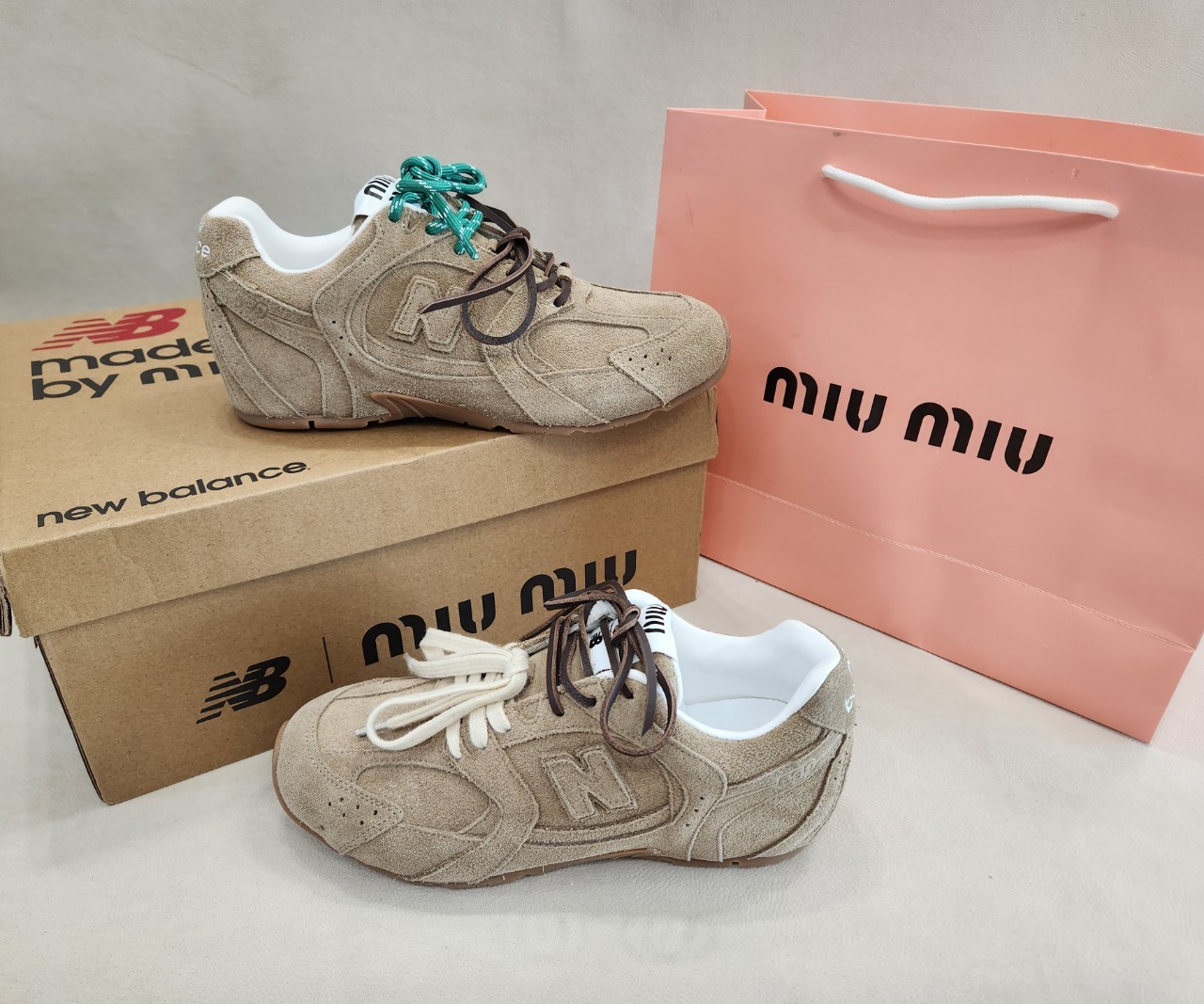 [국내배송]뉴발란스 x 미우 미우 530 스웨이드 메쉬 이시영 스니커즈 에크루